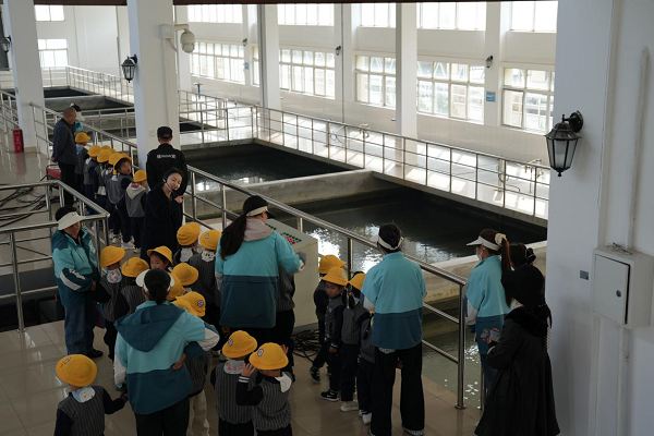 为贴合幼儿认知特点,公司精心安排了4名专业讲解员、10名引导员及6名安全员,全程保障活动安全有序开展。在讲解员生动通俗的引导下,孩子们分组依次参观了反应池、沉淀池、滤池、清水池、送水泵房及调度室等核心生产区域,亲眼见证了“浑浊原水”变身“洁净自来水”的奇妙过程。在反应池和沉淀池,讲解员用“魔法药剂”的生动比喻,向孩子们讲解混凝剂的作用,引导大家观察水中杂质凝结成絮状物并沉淀的过程;在滤池,工作人员现场演示过滤原理,让孩子们直观感受水的净化效果;在清水池,孩子们了解到洁净水的储存与调配方式;在送水泵房和调度室,自动化供水设备、城市供水管网实时运行画面,让孩子们真切感受到城市供水系统的智慧与高效,读懂了每一滴水从水厂到家中水龙头的完整旅程。
